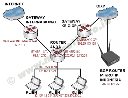 Dalam artikel ini, akan dibahas cara untuk melakukan BGP-Peer ke BGP Router Mikrotik Indonesia untuk melakukan pemisahan gateway untuk koneksi internet internasional dan OpenIXP (NICE). Setelah pemisahan koneksi ini dilakukan, selanjutnya akan dibuat queue untuk tiap klien, yang bisa membatasi penggunaan untuk bandwidth internasional dan OpenIXP (NICE).