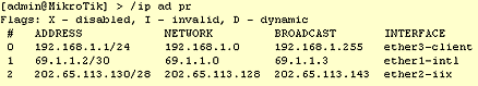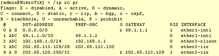 [admin@MikroTik] > /ip fi nat pr Flags: X - disabled, I - invalid, D - dynamic 0 chain=srcnat out-interface=ether1-intl action=masquerade 1 chain=srcnat out-interface=ether2-iix action=masquerade |