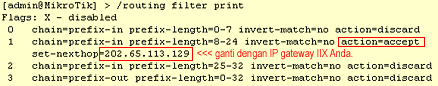 Sedangkan karena sifat BGP-Peer ini hanya Anda menerima informasi routing saja, di mana Anda tidak dapat melakukan advertisement, maka harus dilakukan blok untuk semua prefix yang dikirimkan, dan kita beri nama prefix-out.