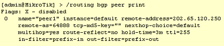 Dan langkah terakhir pada konfigurasi BGP ini adalah konfigurasi peer. AS Number BGP Router Mikrotik Indonesia adalah 64888 dan IP Addressnya adalah 202.65.120.250. Karena kita sulit menentukan berapa hop jarak BGP Router Mikrotik Indonesia dengan Router Anda, maka kita melakukan konfigurasi TTL menjadi 255. Jangan lupa mengatur rule prefix-in dan prefix-out sesuai dengan prefix yang telah kita buat sebelumnya.