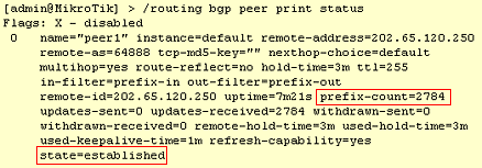 Setelah langkah ini, seharusnya BGP Router Mikrotik sudah dapat terkoneksi dengan Router Anda. Koneksi ini ditandai dengan status peer yang menjadi "established" dan akan dicantumkan pula jumlah informasi routing yang diterima. Anda juga bisa mengecek status peer ini dari sisi BGP Router Mikrotik Indonesia dengan melihat pada halaman ini.
