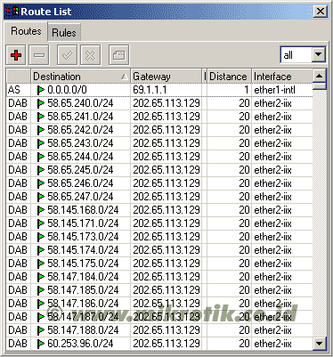 Pertama-tama, pastikan bahwa Anda menggunakan gateway internasional Anda sebagai default route, dalam contoh ini adalah 69.1.1.1. Kemudian Anda perlu membuat sebuah static route ke mesin BGP Mikrotik Indonesia, yaitu IP 202.65.120.250.