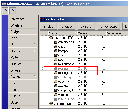 Cek pula pada bagian IP Route, seharusnya sudah diterima ribuan informasi routing, dan pastikan bahwa gatewaynya sesuai dengan gateway OpenIXP (NICE) Anda, dan berada pada interface yang benar, dalam contoh ini adalah "ether2-iix".