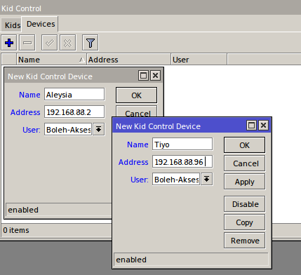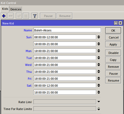 Sebagai langkah preventif atau lebih mengontrol penggunaan internet terutama pengguna anak-anak maka kita bisa menggunakan fitur 'Kid Control' yang ada di MikroTik. Fitur 'Kid Control' sendiri pada saat artikel ini dibuat masih dalam proses pengembangan (release candidate), namun dari segi fungsinya secara garis besar lebih pada pengaturan waktu yaitu kapan boleh akses internet dan kapan koneksi internet dinonaktifkan. Dengan alternatif cara yang lain sebenarnya kita bisa membuat pengaturan firewall filter dan dikombinasikan dengan Script+Scheduler. Namun dengan fitur 'Kid Control' ini konfigurasi tersebut menjadi lebih mudah.