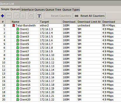 Kami telah melakukan uji coba pada router ini dengan melakukan test bandwith upload dan juga download dilakukan oleh 20 client secara bersamaan. Dengan total troughput bandwith sebesar 100Mbps dengan masing-masing bandwith sebesar 5Mbps (dibagi menggunakan Simple Queue untuk masing-masing client).