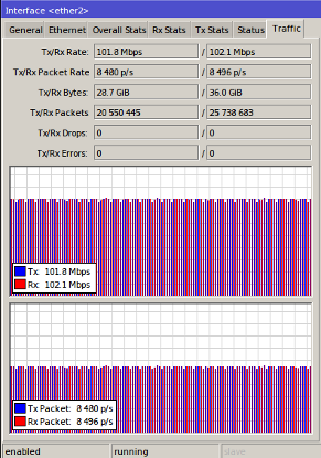 Hasilnya cukup memuaskan. Dengan penggunaan resource CPU yang lumayan kecil, yaitu sekitar 40%, RB962UiGS-5HacT2HnT (hAP-ac) mampu meng-handle trafik sebesar 100Mbps dengan digunakan oleh 20 client bersamaan.